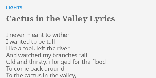 Related : Lights Cactus In The Valley Lyrics - I never meant to wither, i wanted to be tall like a fool, left the river, and watched my branches fall old and thirsty, i longed for the flood to come back around to the cactus in the valley that's about to crumble down and wipe the mark of sadness from my face show me that your love will never change if..