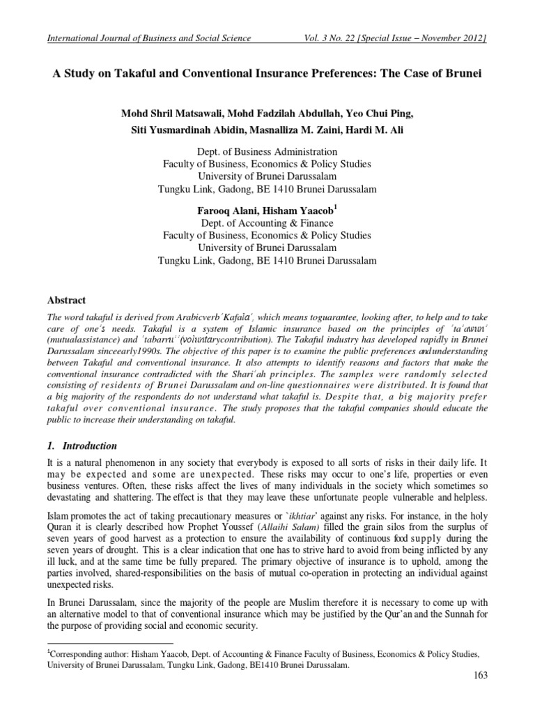 Takaful is an islamic insurance contract introduced to substitute the conventional insurance which has been precluded by nearly all muslim scholars as it encompasses the. The scholars point towards two. Most muslim scholars consider that conventional insurance is prohibited in islam, except where required by local law (such as compulsory driving insurance in the uk) while there is no shariah compliant alternative. Conventional motor insurance provided a contract between insurer and insured and the cover is under the private car insurance which aim to minimize the risk of the damage or as a conclusion, there is the comparison and differences between motor takaful and conventional motor insurance. Same scientific rules and actuarial approaches to mortality rates, morbidity rates, loss ratios, claim experience and discounted cash flows for calculating price of risk and evaluation of.